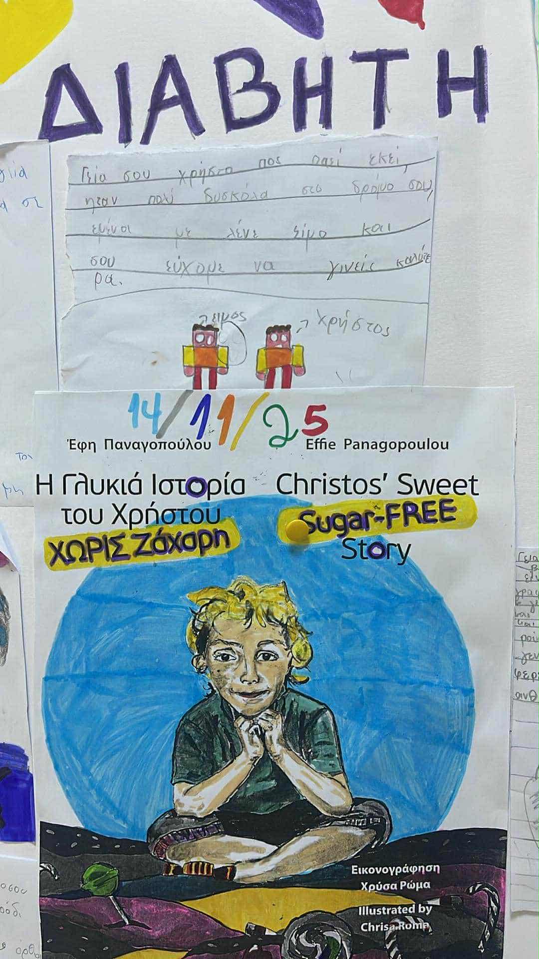 Διαβάσαμε στην τάξη το βιβλίο « η γλυκιά ιστορία του Χρήστου χωρίς ζάχαρη» που αναφέρεται στη ζωή ενός παιδιού που σε ηλικία 6 ετών ανακάλυψε ότι πάσχει από διαβήτη τύπου 1. Αναλύσαμε τι είναι Σακχαρώδης διαβήτης και τα παιδιά κατανοήσαν το θέμα με απλό και παιδικό τρόπο. Στη συνέχεια, συζητήσαμε για τη σημασία μιας ισορροπημένης διατροφής, της άσκησης και της σωστής φροντίδας του σώματος.